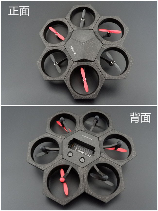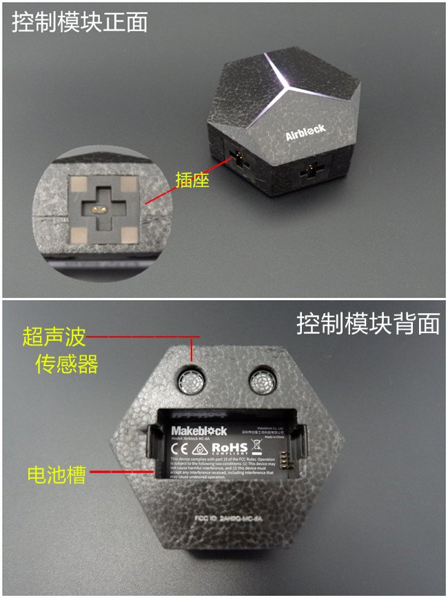 Airblock無人機的模塊採用了自由組合的六邊形,這也讓Airblock的外形可以千變萬化。中心控制模塊這也是整個無人機的大腦,六邊分別是6個動力模塊的磁性插頭,頂部是3顆彩燈其做為電源指示燈和連結信號燈,還可以在手機的應用程序中通過程式設計改變亮度和顏色。裡面有藍牙、陀螺儀、氣壓計、主控晶片等原件。底部是電池倉Airblock沒有專門的電源開關,裝入電池後,主控模塊自動就進入待機的狀態。電池倉的邊上是2個超聲波感測器,這個是探測與地面的距離的,飛行的時候結合內部的氣壓計感知飛行高度變化,東西雖小,但是技術含量很高的。