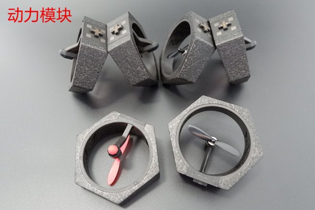 動力模塊由磁性插頭、支架、螺旋槳、電機等元件組成。6個動力模塊分別為3個黑色正漿和3個紅色反漿,電機當然分別是正轉和反轉,安裝的時候需要對應控制模塊的插頭,紅漿的模塊裝在控制模塊的1、3、5埠,黑漿的裝在2/4/6埠裝錯了的話,是不能正常起飛的。還有就是6個動力模塊其中一個腳墊是紅色的,它也是這臺無人機的機頭,運轉的時候支架內的指示燈也是紅色的,其它的五個腳墊都是黑色的,指示燈的顏色都是綠色的。模塊的外殼使用工程泡沫資料製作,既能保護身邊的人不被刮傷,同時還讓無人機的更加堅固,即使發生碰撞、跌落都不會影響Airblock的再次使用。