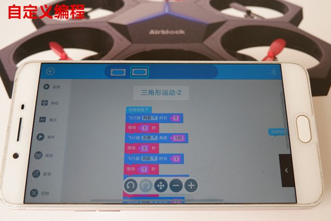 在控制方面,Airblock無需獨立的操控手柄,使用下載的手機App軟件就可以完成複雜的空中動作,如果你有程式設計愛好的話,還可以通過編寫程式控制Airblock的飛行路線和動作,並且在自定義模式裏,可以通過編輯創建一個屬於自己的控制程式。