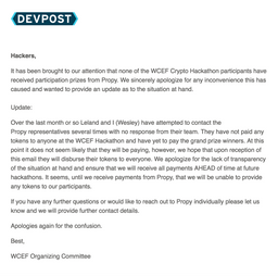 kjnk(25)•in #cryptocurrency•2885 days agoPropy fails to pay $200,000 in prize money to WCEF hackathon winnersThe World Cryptocurrency Economic Forum, or WCEF, held a hackathon and a conference in the Bay Area in January this year. Propy, a real estate cryptocurrency pr...3kjnk(25)•in cryptocurrency•2885 days agoPropy fails to pay $200,000 in prize money to WCEF hackathon winnersThe World Cryptocurrency Economic Forum, or WCEF, held a hackathon and a conference in the Bay Area in January this year. Propy, a real estate cryptocurrency pr...3