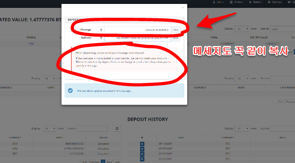 Address창 밑에 메세지도 꼭 같이 복사해서 입금하라고 쓰여있는데 이거 안 읽어보고 그냥 Address만 복사해서 입금해버렸어요. 이거 몰랐던 분들은 이 글 꼭 참고하셔서 비트렉스로 입금할 때 메세지도 함께 복사해서 입금하세요!