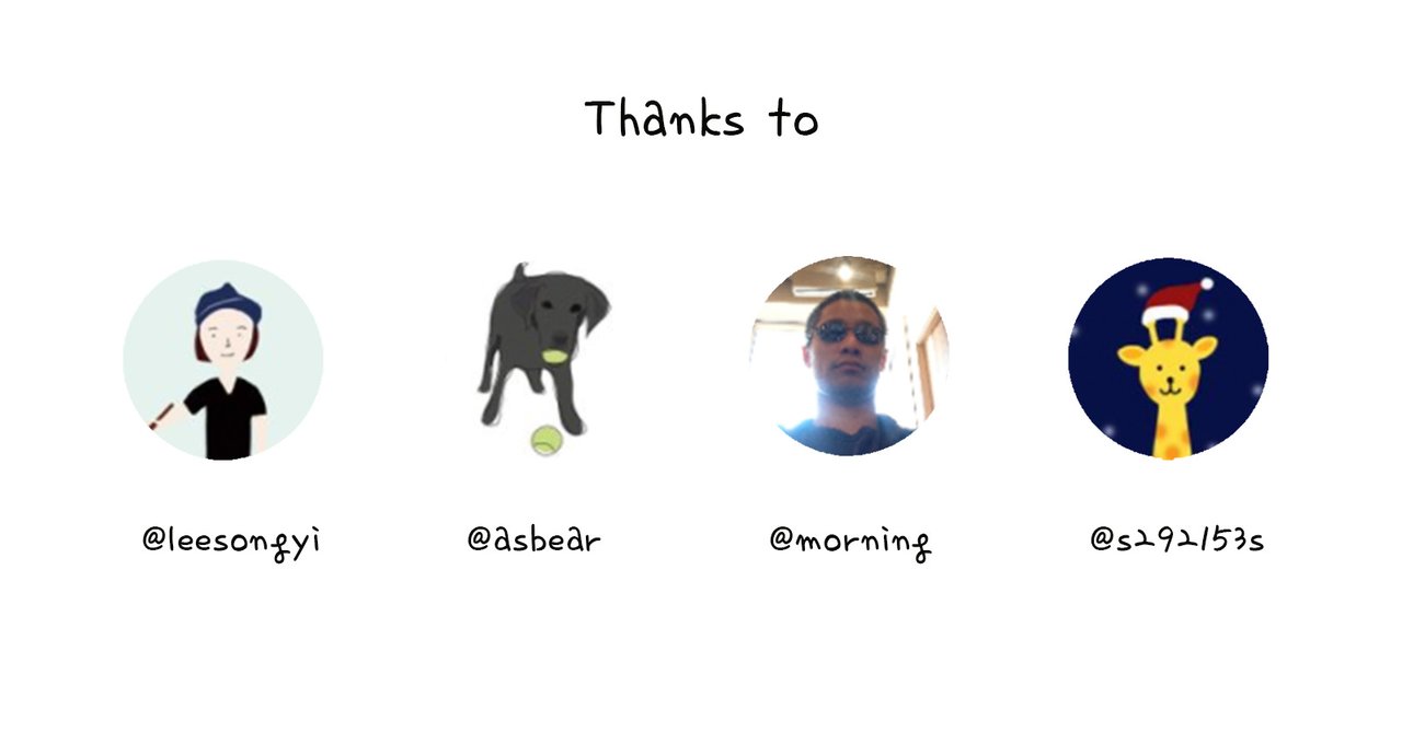 이분들의 도움으로 스팀잇 광고가 만들어졌습니다. 우선 디자인 & 편집을 맡아주신 송이님, 문구를 창작해 주신 애즈비어님과 모닝님, 그리고 두 분이 만들어 주신 문구를 편집해 주신 기린님 감사합니다!