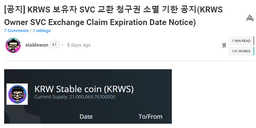 stablewon(25)•in #kr•2477 days ago[공지] KRWS 보유자 SVC 교환 청구권 소멸 기한 공지(KRWS Owner SVC Exchange Claim Expiration Date Notice)댓글 드랍을 통해 많은 분들이 KRWS 를 보유하고 계십니다. 현재 1 KRWS 는 1 SVC 로 교환 되고 있습니다. 교환 청구가 예상만큼 되지 않아 @stablewon 계정의 계획 진행에 어려움을 겪고 있습니다. 교환 요청을 2019년 4월 10일 24:00시(서울 시간 기준) 까지...7stablewon(25)•in kr•2477 days ago[공지] KRWS 보유자 SVC 교환 청구권 소멸 기한 공지(KRWS Owner SVC Exchange Claim Expiration Date Notice)댓글 드랍을 통해 많은 분들이 KRWS 를 보유하고 계십니다. 현재 1 KRWS 는 1 SVC 로 교환 되고 있습니다. 교환 청구가 예상만큼 되지 않아 @stablewon 계정의 계획 진행에 어려움을 겪고 있습니다. 교환 요청을 2019년 4월 10일 24:00시(서울 시간 기준) 까지...7