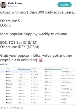 lovelong2233(25)•in #cnbitcoinlove•2699 days ago以太坊EOS一共只有8个活跃的DAPP,你说尴尬不尴尬? 这位名为Kevin Rooke的人(网络上称之为加密币研究人员),8月27日在twitter发表了这篇推文。在以太坊和EOS上的各个DAPP中,日活跃量超过300人的DAPP分别只有5个和3个。 他还分别列出了以太坊和EOS两个DAPP每周tx销量,其中EOS上的EOS Bet每周销售1810万美元,以太...10$0.00lovelong2233(25)•in cnbitcoinlove•2699 days ago以太坊EOS一共只有8个活跃的DAPP,你说尴尬不尴尬? 这位名为Kevin Rooke的人(网络上称之为加密币研究人员),8月27日在twitter发表了这篇推文。在以太坊和EOS上的各个DAPP中,日活跃量超过300人的DAPP分别只有5个和3个。 他还分别列出了以太坊和EOS两个DAPP每周tx销量,其中EOS上的EOS Bet每周销售1810万美元,以太...10$0.00