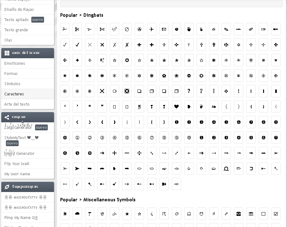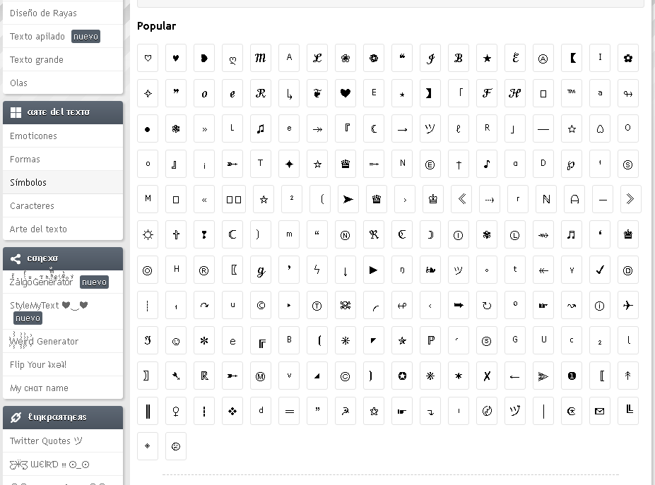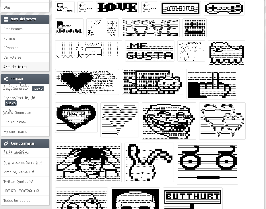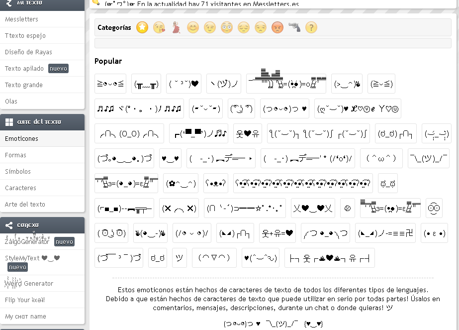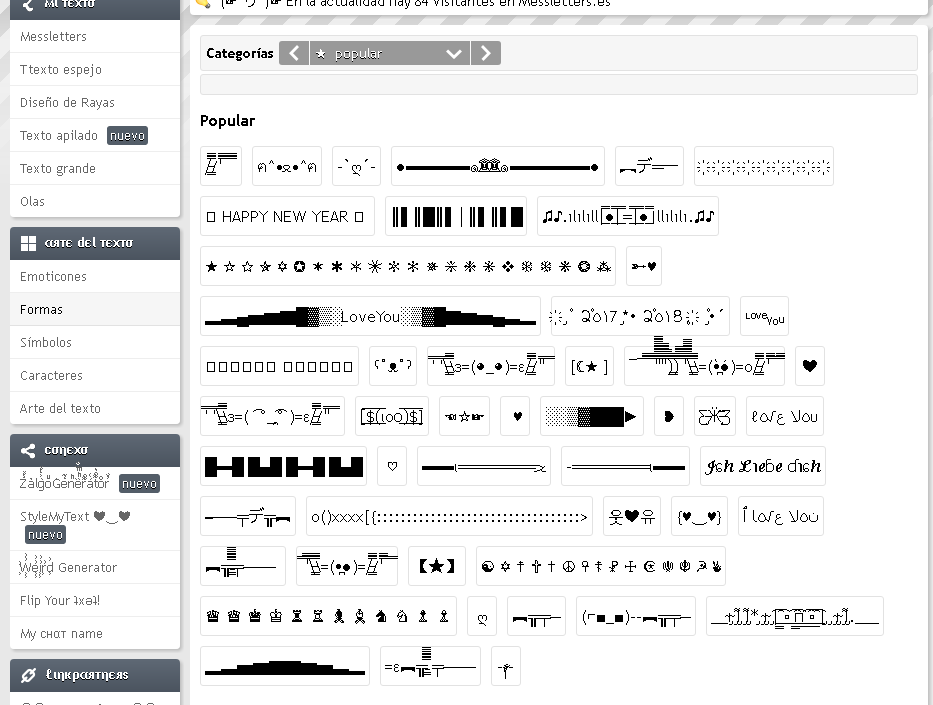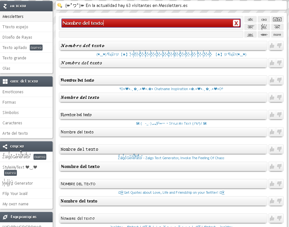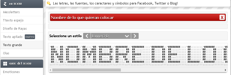 Ahora explicare un poco la interfaz, en la izquierda podemos ver una serie de opciones en una casilla, tales como texto espejo, diseño de rayas, texto apilado, texto grande y olas, en la casilla de abajo tenemos opciones como emociones, formas, símbolos, caracteres y arte de texto, esto nos llevara a distintas opciones para agregar a nuestro texto.
