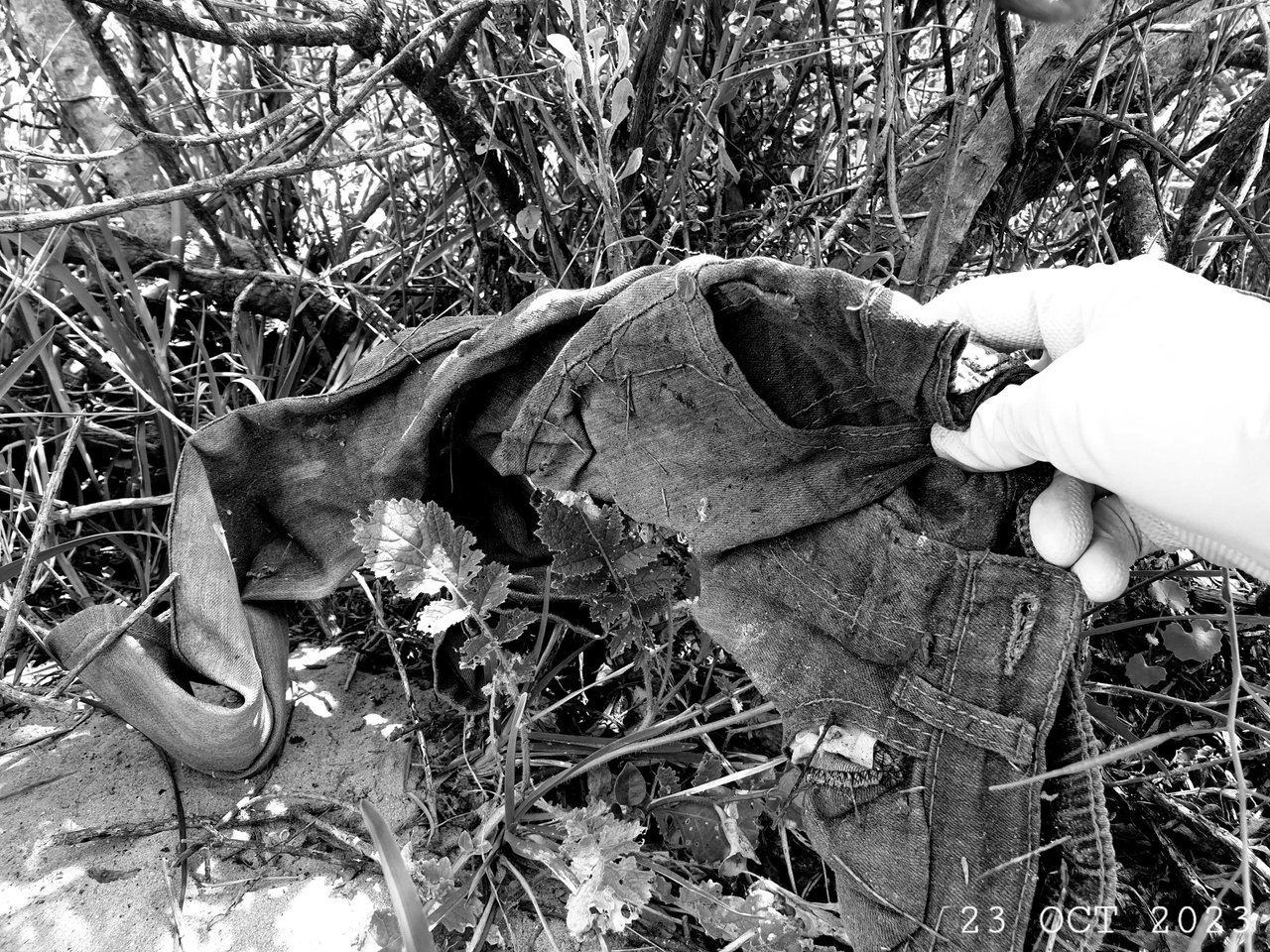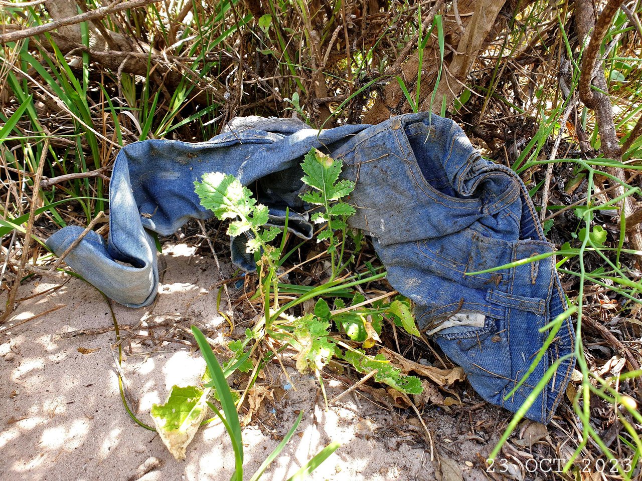An old pair of discarded denim trousers. I'm usually very careful when I bag any dirty clothing items like this (so as to not accidentally touch my skin on any part thereof). Who knows what kind of germs may be present!