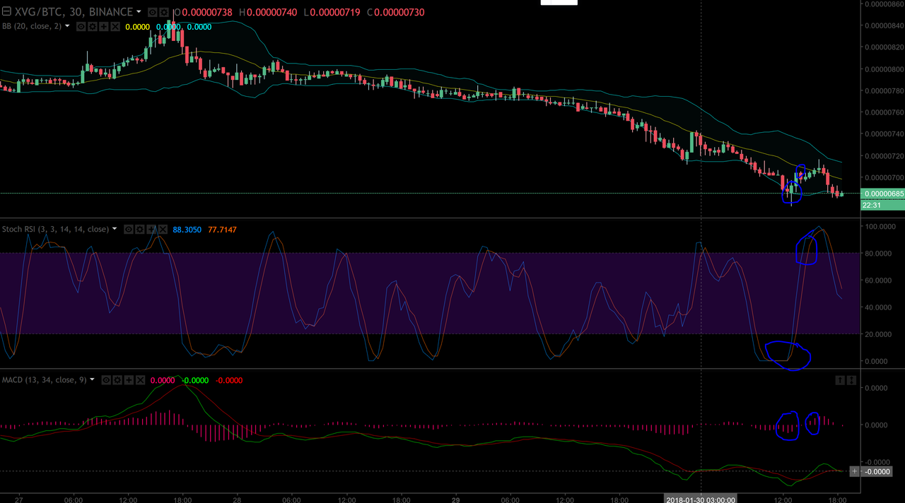 In the picture above, you can see with the blue circles my entry and exit points. I use Trading View with Bollinger Bands, Macd, and StochRSI. Now, when it comes to Bollinger bands, I can see that I am down at the lower band which is considered the support area. Anytime you are near this band, you can expect a turn (not always because a lot of times it will break). To back this up, we see StochRSI indicating an uptrend is forming. Lastly we see the negative trend bars on the MACD starting to become less negative. This is probably the most important part. The best timing for entry and exit is actually when these negative and positive bars start becoming less negative or less positive. If you look at the history, you will see that generally, these bars form hills or dips that are somewhat nicely rounded. Occasionally they will change in the opposite direction but statistically speaking once they start moving in one direction, they will keep moving in that direction until a trend change occurs. Your goal is to identify that change.