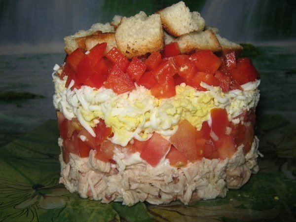 Chicken breast, boiled and finely chop. Cut the tomatoes into small cubes, salt, garlic, finely minced