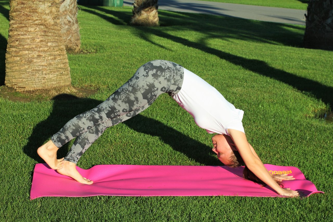 Second — you should fix in adho mukha shvanasana and try to put the heels on the floor, one after one (as shown on the photo below).