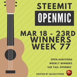 luzcypher(25)•in #openmic•2857 days agoSteemit Open Mic Week 77 Winners - See Who Won Open Mic And Join Us This WeekThanks to everyone who entered and supported Open Mic Week 77. Community support for Open Mic has been tremendous and is one of many projects bringing the music...17629$15.86luzcypher(25)•in openmic•2857 days agoSteemit Open Mic Week 77 Winners - See Who Won Open Mic And Join Us This WeekThanks to everyone who entered and supported Open Mic Week 77. Community support for Open Mic has been tremendous and is one of many projects bringing the music...17629$15.86
