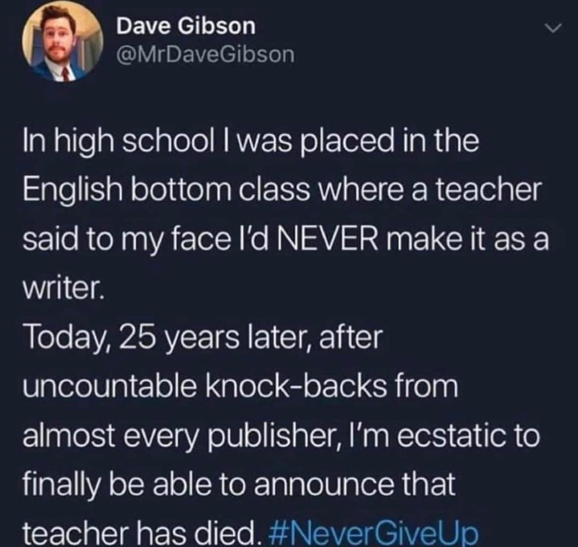 Dave Gibson: In high school I was placed in the English bottom class where a teacher said to my face I'd NEVER make it as a writer. Today, 25 years later, after uncountable knock-backs from almost every publisher, I'm ecstatic to finally be able to announce that teacher has died. #NeverGiveUp