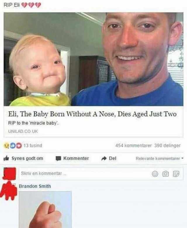 Eli, the baby born without a nose, died aged just two. RIP to the 'miracle baby'. Brandon Smith: (got your nose gesture).