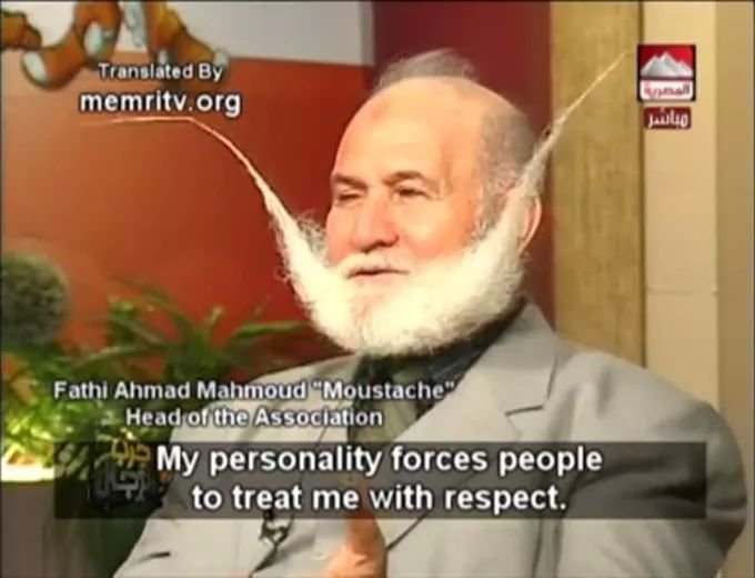 (Man with a white beard pointing sideways like a big moustache.) Fathi Ahmad Mahmood "Moustache"