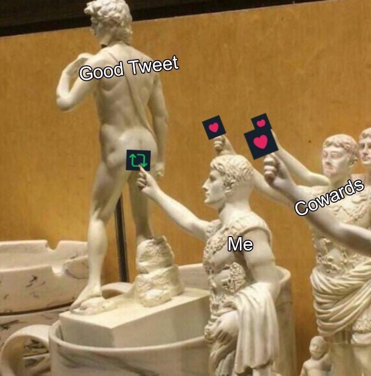 (Miniature marble Roman statues depicting how I retweet a good tweet, while cowards only like it. The retweet symbol covers a statue's bare buttocks.)