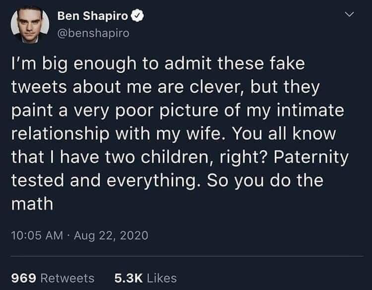 Ben Shapiro: I'm big enough to admit these fake tweets about me are clever, but they paint a very poor picture of my intimate relationship with my wife. You all know that I have two children, right? Paternity tested and everything. So you do the math.