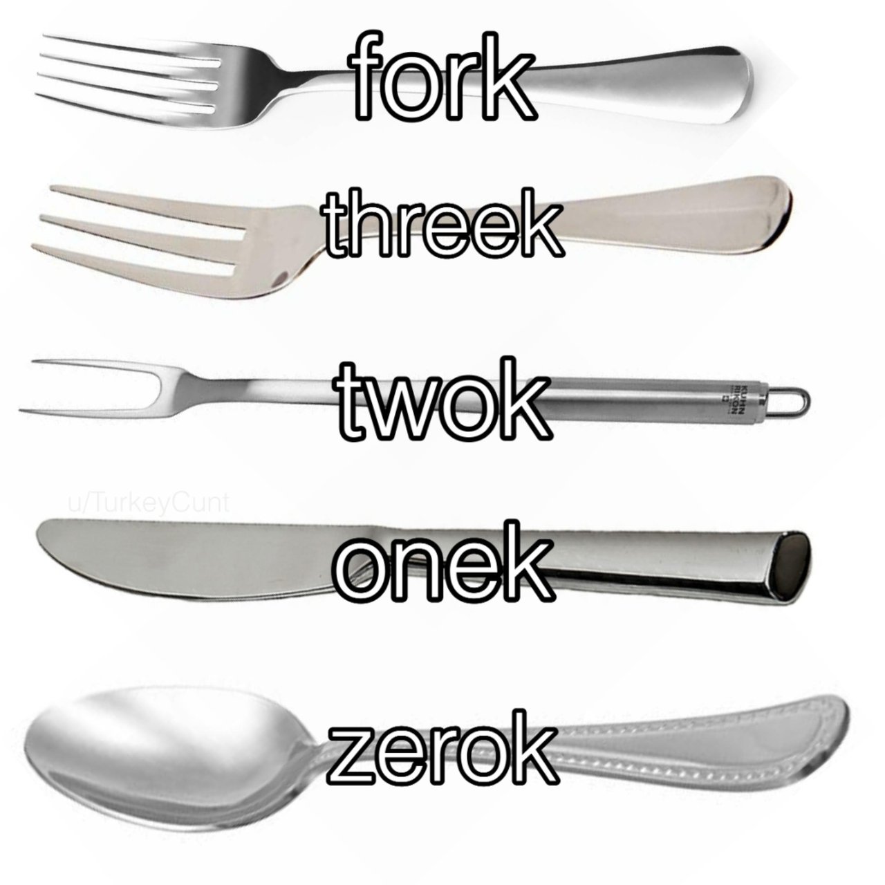 (Images of forks with four, three, and two prongs, followed by a knife and a spoon.) fork, threek, twok, onek, zerok