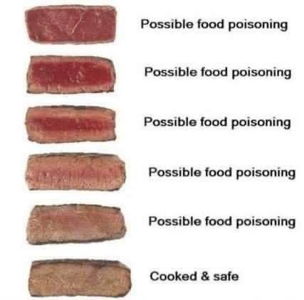 Five levels of cooking beef: Possible food poisoning. Well done: Cooked & safe.