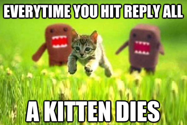 Well, as of right now, I have received over 40 emails of people saying "read and understood" because people used the reply all vs the reply button. This drives me crazy since i get on average 2-300 emails that have absolutely nothing to do with me. I spend more time deleting them than reading them.