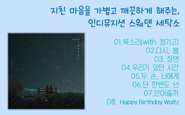 ------------ 스웨덴 세탁소의 노래는 이름처럼 지친 제 마음을 씻겨주는 것 같아요! 노래를 들으면 마음이 편해지면서, 몸도 자연스레 편해지게 되는것 같아요 ㅎㅎ 제가 좋아하는 스웨덴 세탁소 노래를 소개합니다!