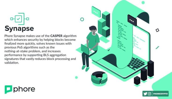 Unlike Phore’s current architecture which uses the Proof of Stake (PoS) 3.0 consensus algorithm, Phore Synapse makes use of the CASPER algorithm which enhances security by helping blocks become finalized more quickly, and reducing blockchain forks. This solves known issues with previous PoS algorithms such as the nothing-at-stake problem and increases performance by supporting BLS aggregation signatures that vastly reduce block processing and validation.