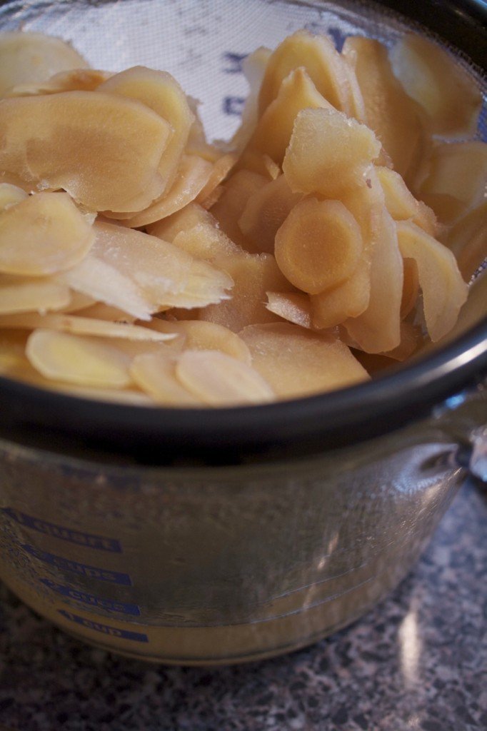 Yeah, about that thin.Put the ginger in a pot and add enough water to just cover it, about 2 c.Bring the water to a boil, and then boil it for 7-8 minutes before draining off the water.Then add 2 c water, sugar, and honey to the same pot and bring this to a boil, uncovered. After it has boiled for about 10 minutes take a piece out and bite it. You want the ginger tender and a little on the sweet side, but the exact consistency is entirely subjective.I ended up boiling mine for about 12-14 minutes.Once the boiling is done, drain off this liquid. I would suggest saving this liquid, though, because it’s pretty much a ginger simple syrup. And you know what you make with ginger simple syrup?