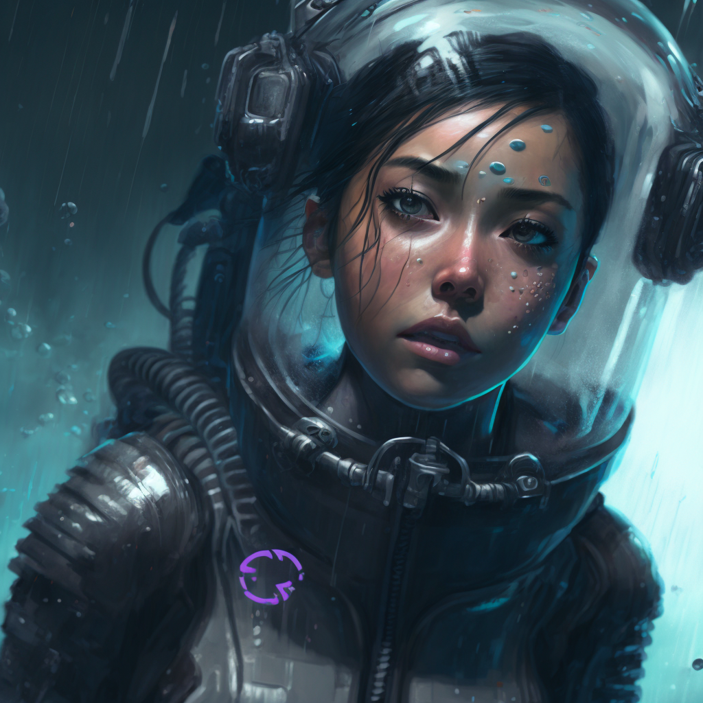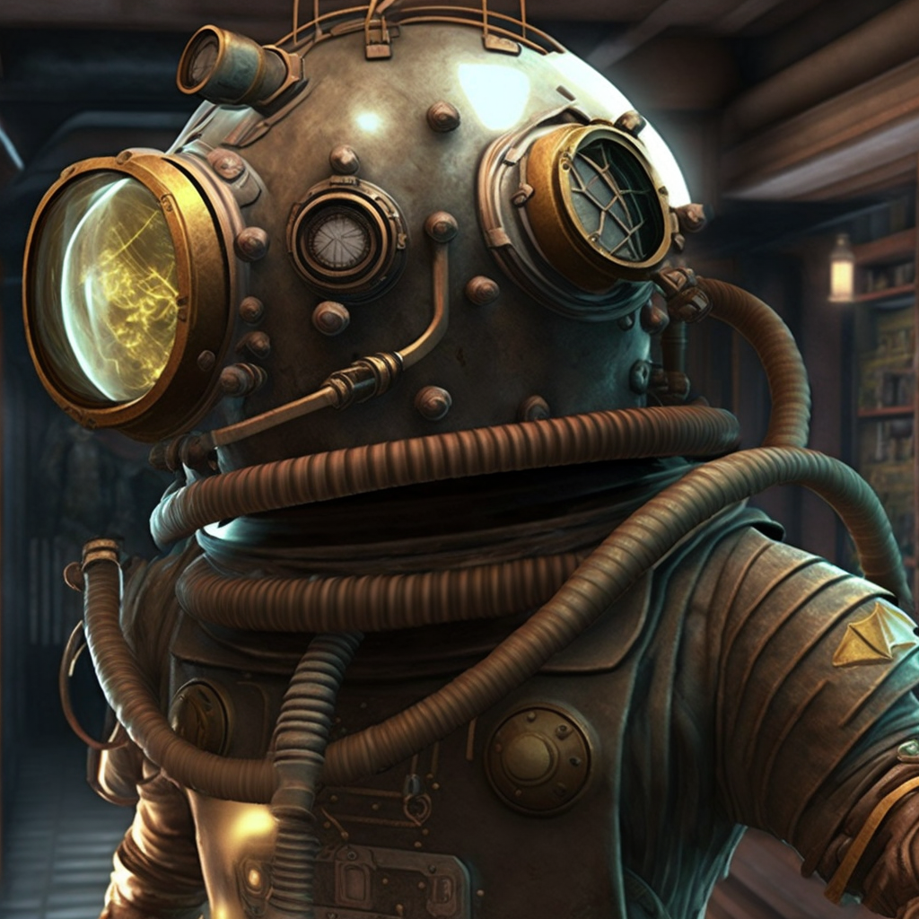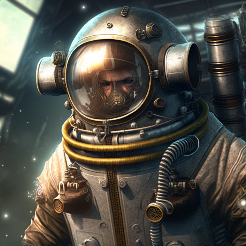 Conversely, adding "steampunk" to the prompt rather than "cyberpunk and atompunk" we get a much bulkier spacesuit, more like a personal submarine!