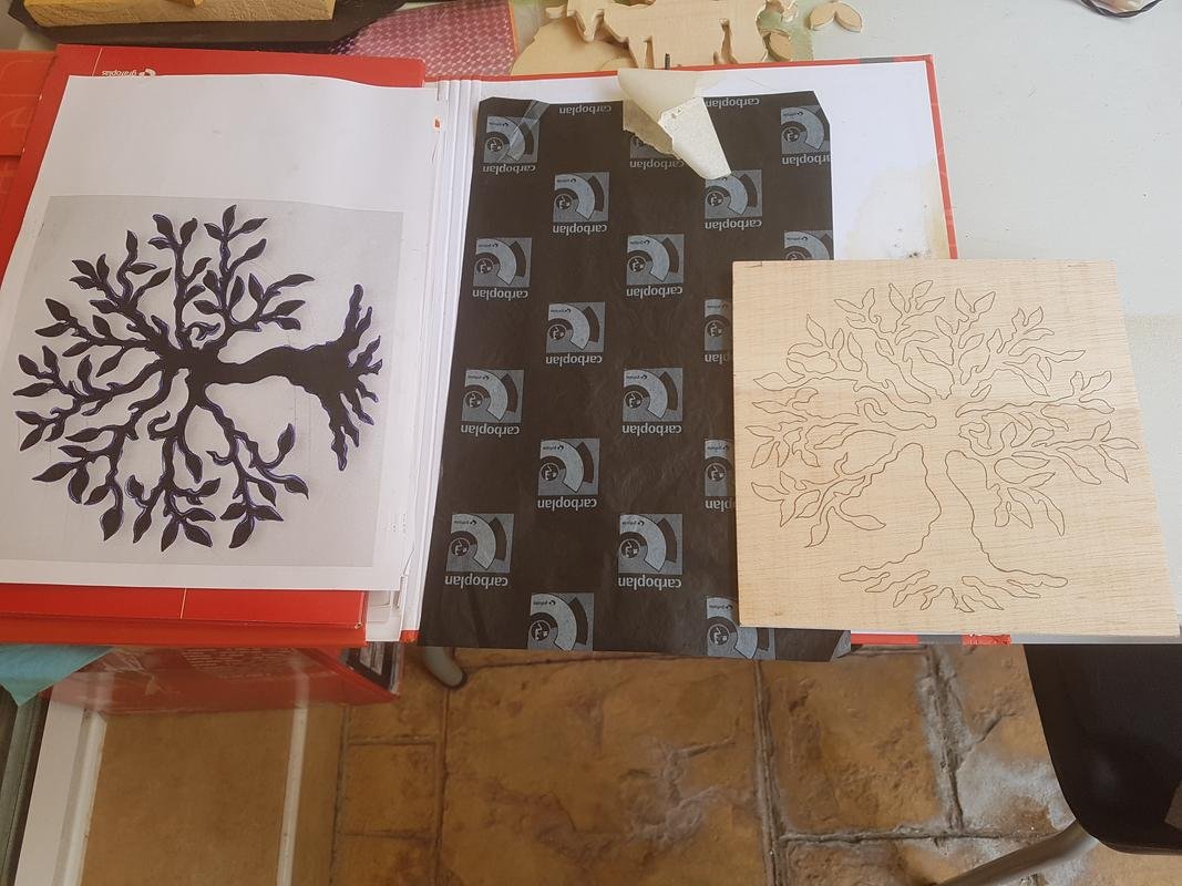 La manera de hacerlo es muy fácil, cogemos nuestro papel especial con las letras carboplan por fuera, y lo pegamos con cinta adhesiva a nuestra madera cubriéndola entera, después colocamos el dibujo que ya tenemos imprimido en la madera y lo sujetamos con unas pinzas, y mas tarde repasamos el dibujo con un boli o lápiz, una vez terminado lo quitamos todo y podremos comprobar que el dibujo que teníamos en el folio, paso sin problemas a nuestra madera