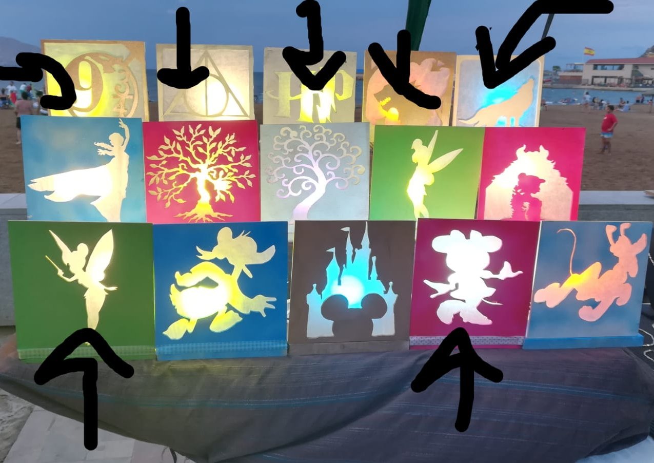 Ahora, viene una de las partes que mas me gustan, darle color a la madera, con la pintura spray, una vez que la pintura ya este seca lo siguiente es, pegar nuestro papel filo detrás de nuestro dibujo, una vez terminado lo que haremos sera pegar la madera que lleva nuestro dibujo encima de otra para poder obtener un soporte, y en la parte de atrás con soportes especiales añadir el cableado y el las bombillas para poder darles luz.