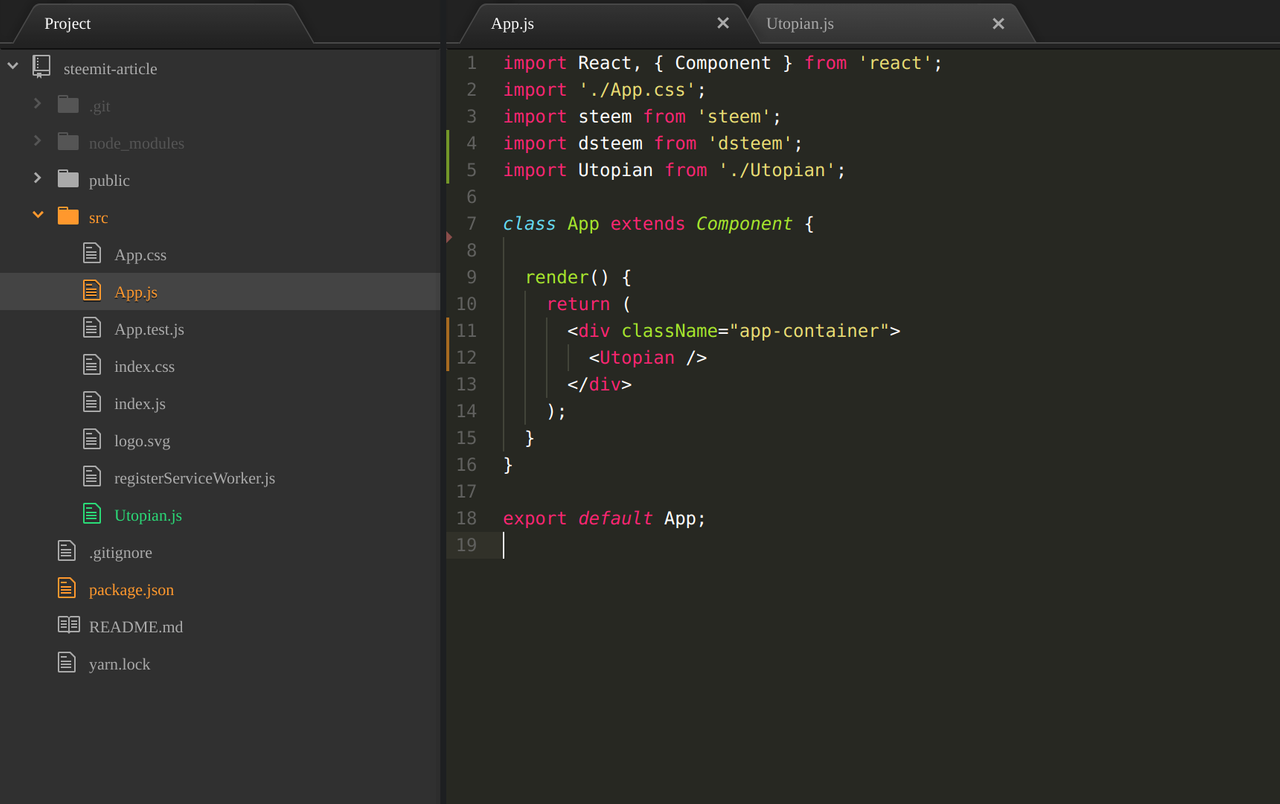 Now that dsteem is installed we can make a new component called Utopian.js and import the library into it and start making API requests to the blockchain. Create a Utopain.js component in the src folder of the app: