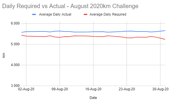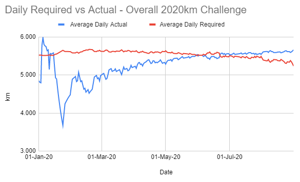 As you can see, the gap between what my actual daily average distance (blue line) and the required daily average (red line) has been fluctuating slightly and only really started to grow further apart at the end of the month. A nice improvement from July!