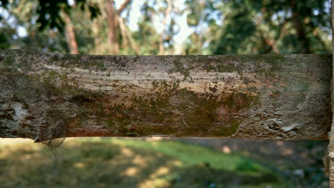 It is a Mango tree. It's log is vertically situated over a rejected pond, near to my uncle house. Some moss cover it's few part, that's why it looks little greenish.