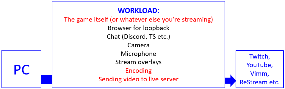 The tough job here, is running the game itself (or whatever software you might be showing your audience) on the PC, while simultaneously doing the encoding (the highlights in red). Some games are more demanding on the CPU than GPU, some are the other way around. This can force you to compromise on either game or stream quality - or both. You can easily find yourself spending more time tweaking settings, than actually playing the game, streaming and interact with chat.