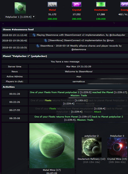 potplucker(25)•in #steemhunt•2860 days agoSteemNova - Space trade game text basedSteemNova Space trade game text based --- Screenshots --- Description Start with one planet and a few resources. Build an empire with many worlds, the best flee...125$0.48potplucker(25)•in steemhunt•2860 days agoSteemNova - Space trade game text basedSteemNova Space trade game text based --- Screenshots --- Description Start with one planet and a few resources. Build an empire with many worlds, the best flee...125$0.48