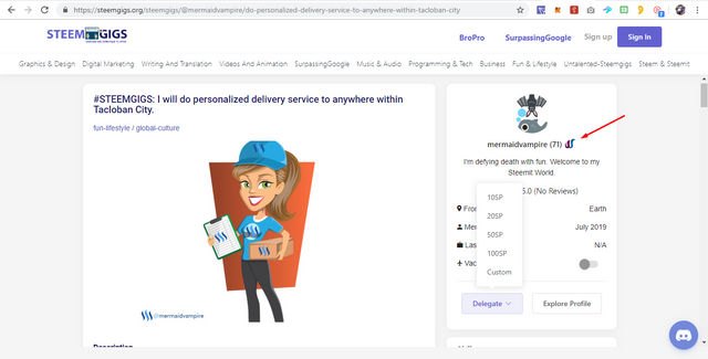 She has got the 'delegate button' and 'certified' tag right beside her post, indicating that we at steemgigs.org reference her for a 'delegation'.