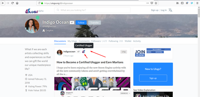 Certfied uloggers have 'a label' beside their profiles that identifies them across 'marlians.com', so please look up to them and look to support them too, via engagement and curation.