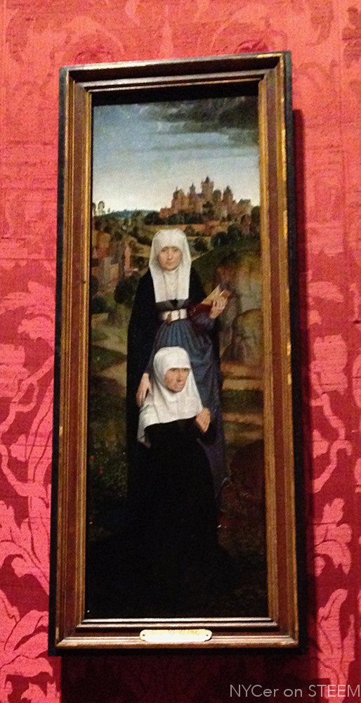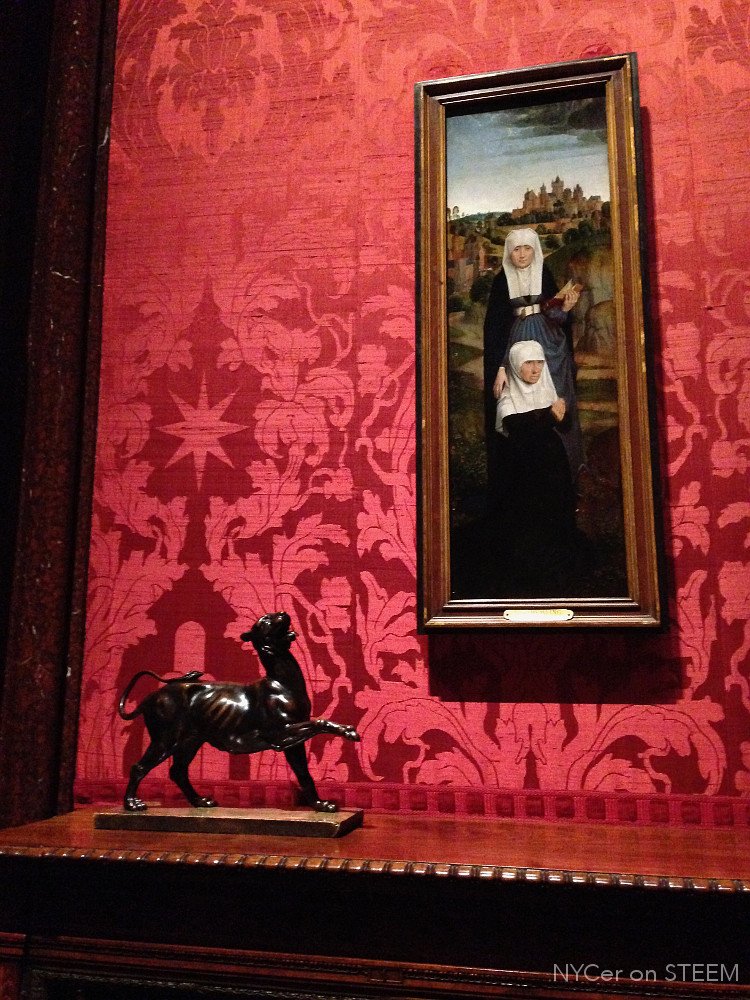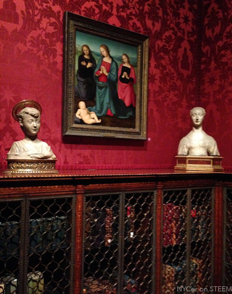 Inside John Pierpont Morgan's study, which he had built in 1906 (along with the library). It's decorated in a Renaissance style, with a wooden ceiling imported from Florence, stained glass windows from Switzerland, and walls covered in dark red silk.