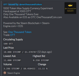 250 One thousand Tokens are going on sale, a littleover 1/4th the MAX supply. There are only 500 OTT One Thousand Tokens in circulation with a MAX supply of One...