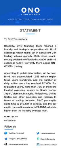 onosocial(25)•in #onot•2536 days agoBit-Z exchange list ONOT today opening ONOT/ETH trading.Statement Recently, ONO founding team reached a friendly and in-depth cooperation with Bit-Z exchange which ranks 5th in consistent 24h trading volume glob...00.142onosocial(25)•in onot•2536 days agoBit-Z exchange list ONOT today opening ONOT/ETH trading.Statement Recently, ONO founding team reached a friendly and in-depth cooperation with Bit-Z exchange which ranks 5th in consistent 24h trading volume glob...00.142