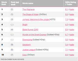 opentorrent(25)•in #news•2908 days agoTop 10 Most Pirated Movies of The Week on BitTorrent – 01/29/18 The top 10 most downloaded movies on BitTorrent are in again. 'Thor Ragnarok' tops the chart this week, followed by ‘The Shape of Water'. 'Jum...0$0.00opentorrent(25)•in news•2908 days agoTop 10 Most Pirated Movies of The Week on BitTorrent – 01/29/18 The top 10 most downloaded movies on BitTorrent are in again. 'Thor Ragnarok' tops the chart this week, followed by ‘The Shape of Water'. 'Jum...0$0.00