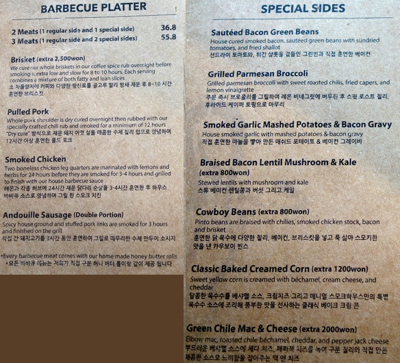 메뉴는 대충 이렇습니다. 2-3인이 방문하신다면 2 Meats 플래터를 선택하시고, 브리스켓, 풀드포크와 맥앤치즈를 주문하시는 걸 추천합니다.