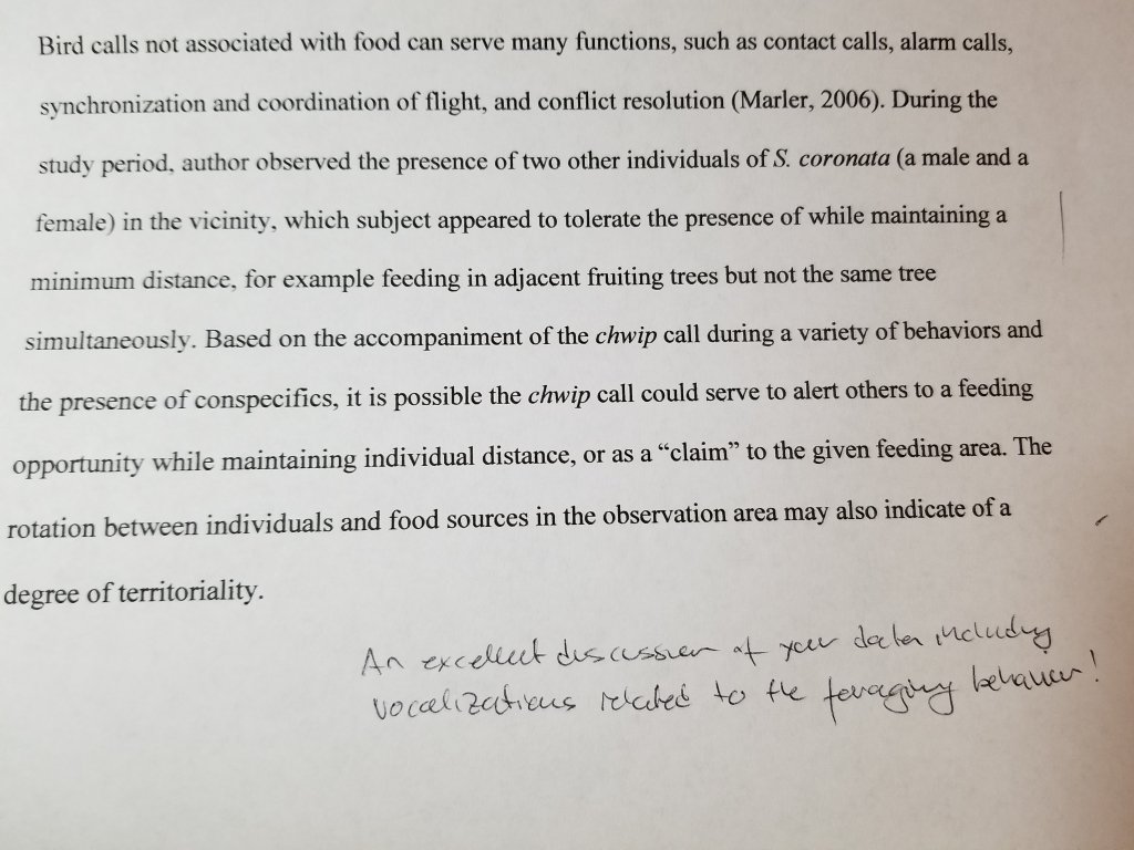 *"An excellent discussion of your data including vocalizations related to the foraging behaviour!"* phew! My professor is an avid birder and even teaches a bird biology class in the spring, so it feels really good to know that my paper, even rushed, was up to par. He even commented on how detailed my introduction was, which was the part I was regretting not expanding on in my first post about the paper.
