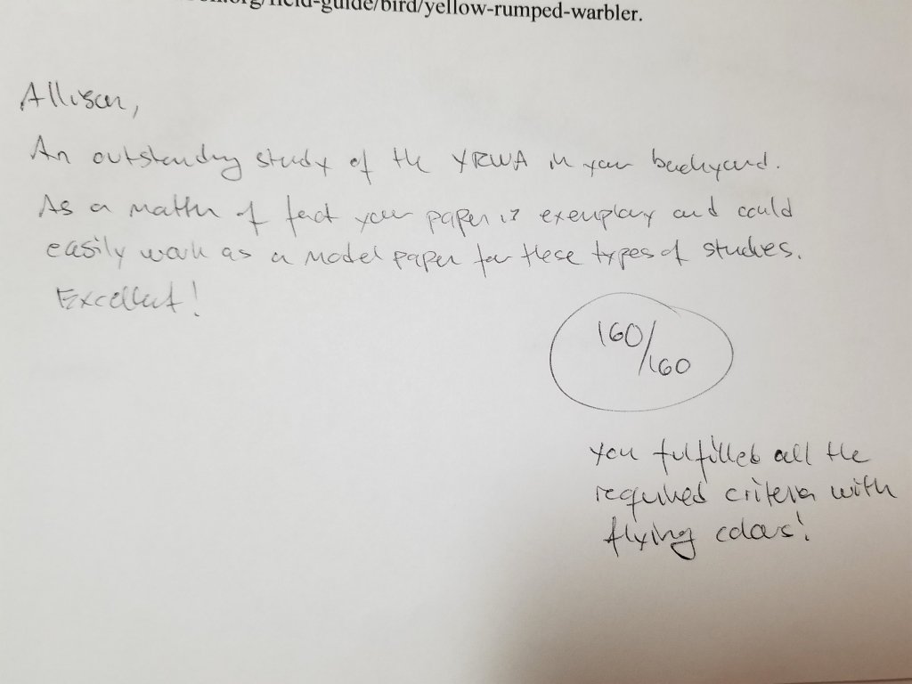 *"An outstanding study of the YRWA (yellow-rumped warbler) in your backyard. As a matter of fact your paper is exemplary and could easily work a model paper for these types of studies. Excellent!"*I was so pleased and relieved! We received our graded papers right before he handed out the final exam, so I did not get to beam about it until after I finished and left the classroom. I proudly informed the family chat (a group chat with my mom and four sisters) and read the comments to my boyfriend over our take-out Veggie Grill dinner.