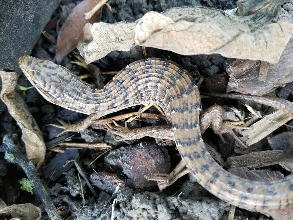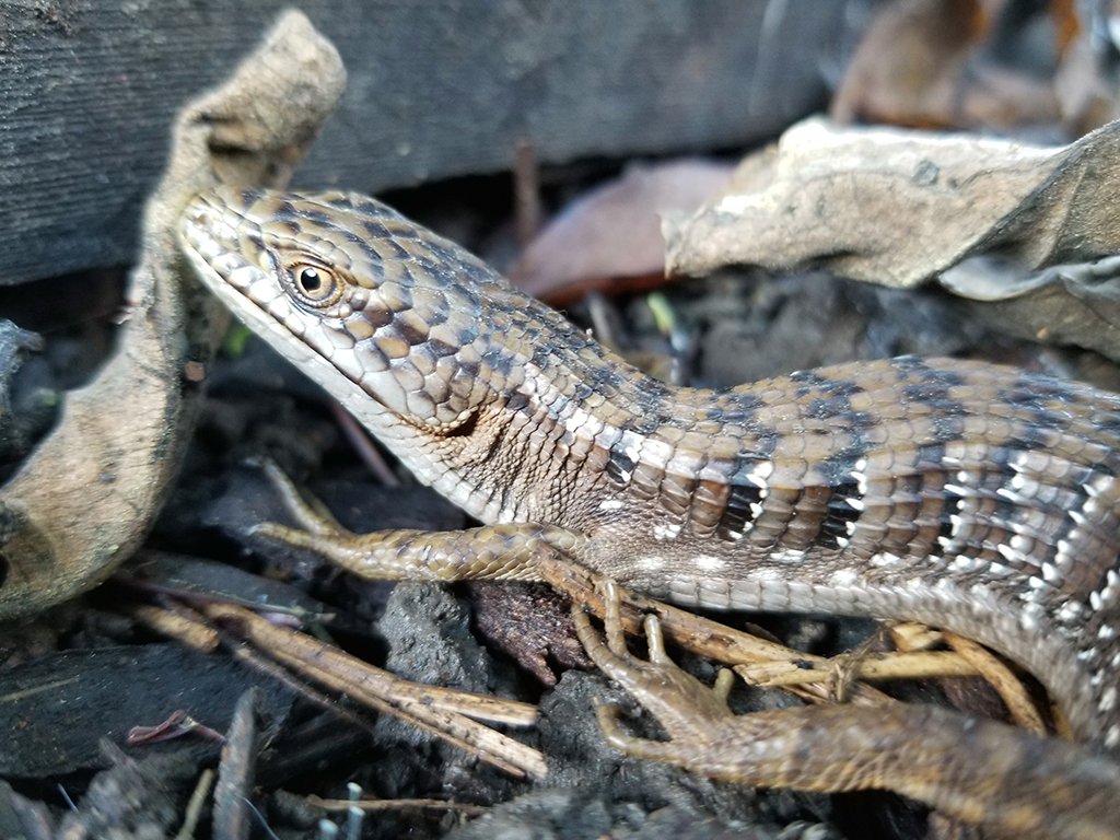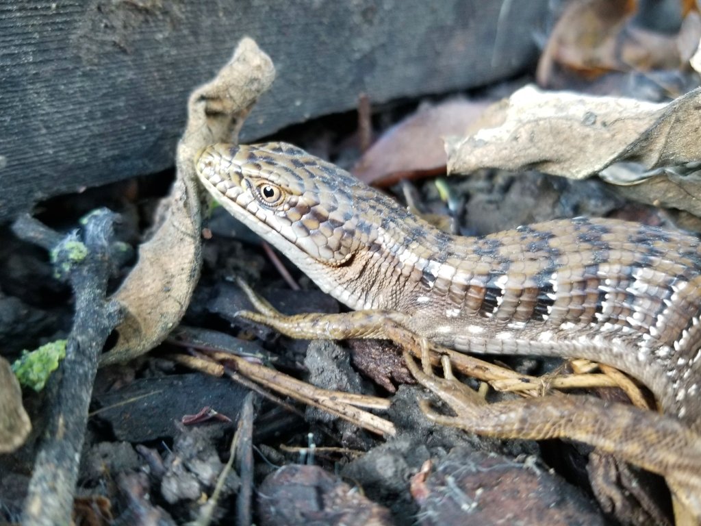 She was curled up a foot away from a couple of salamanders, but quickly unfurled when I put the wood down. There are a couple of species of alligator lizard here in California, and I believe she is a southern alligator lizard, Elgaria multicaronata because of her light eyes. I did not want to stress her out and pick her up, so I did not see her belly which could have provided more clues as to what species she is.