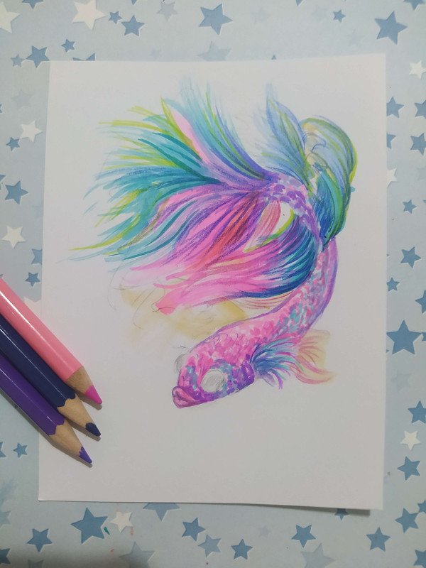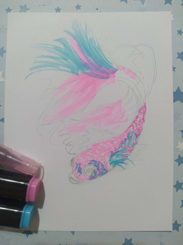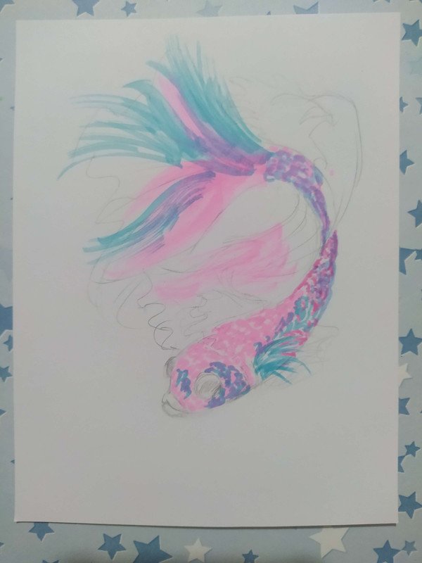 Busque el pez más colorido que encontré y que tuviera mucho movimiento en las aletas. Para este dibujo decidí mezclar todos mis materiales, marcadores, como la base principal, para los detalles de las aletas use creyones y para el agua use acuarelas.