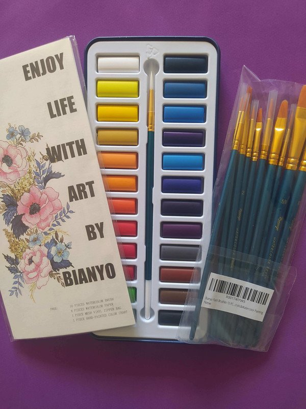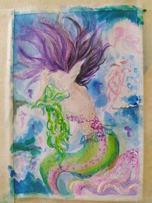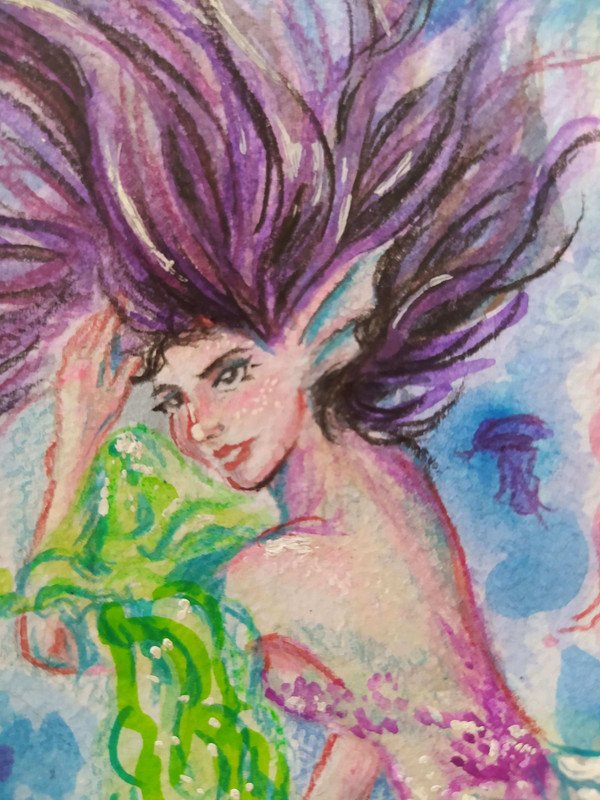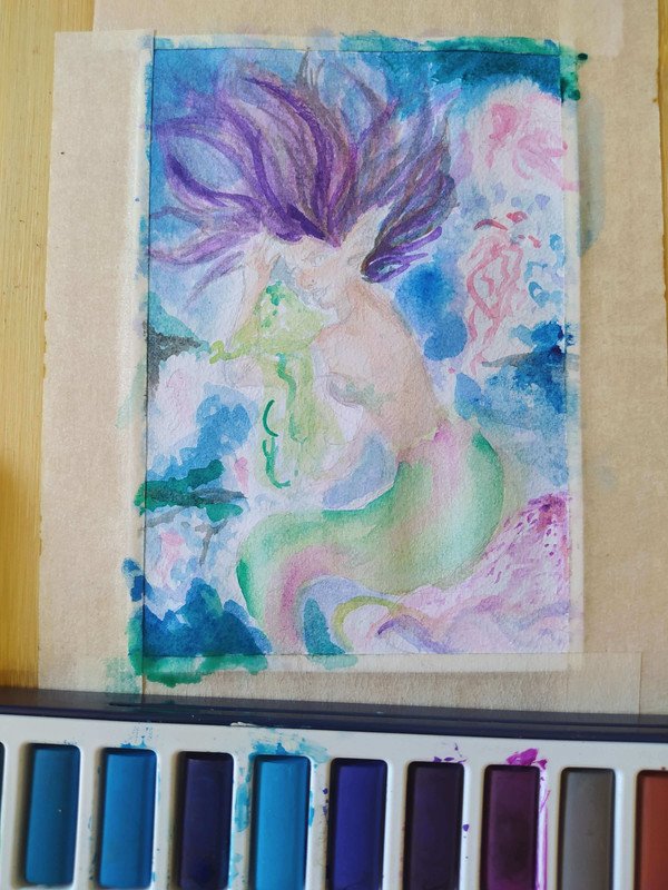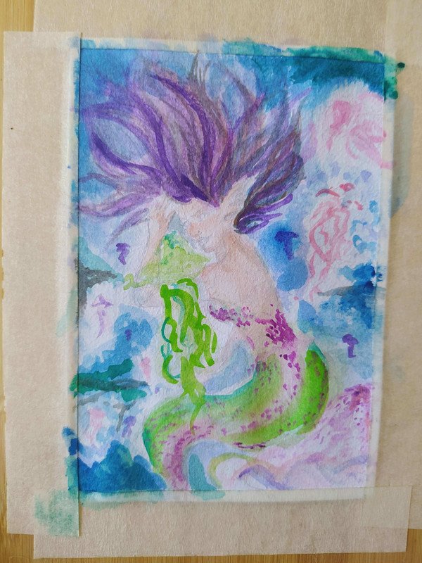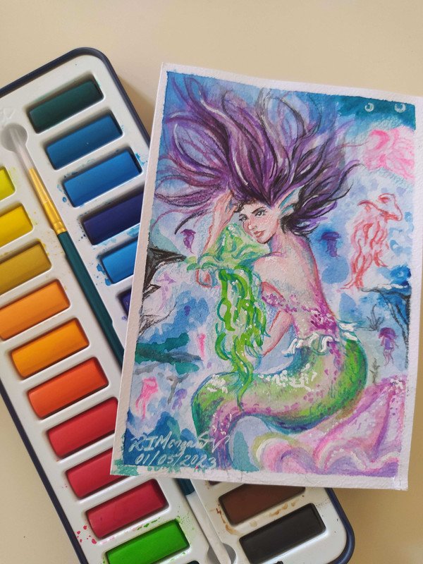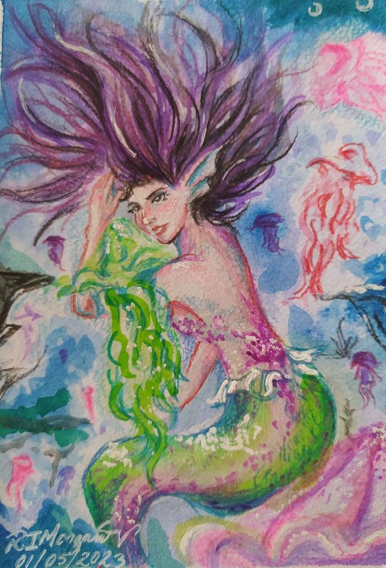 After a long time without drawing I share with you the first mermaid, it is also a great opportunity to use new materials, I got watercolor blocks of Pointer brand (it has very good water resistance, the pigment does not water uncontrollably) and the most special are some watercolors that a neighbor gave me last year from Bianyo brand, very pigmented and bright tones.