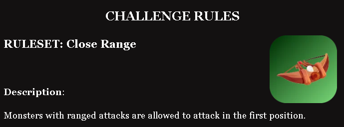 | Selenia Sky, can increase the range damage of all friendly monsters by 1. | Summoner from Dragon element. With this ruleset, we only have the choice to use this monster who can take advantage of this ruleset, because we don't bring Prince Rennyn (Increase range, speed and HP all friendly monster by 1) from Earth element that monster is expensive to rent :). |