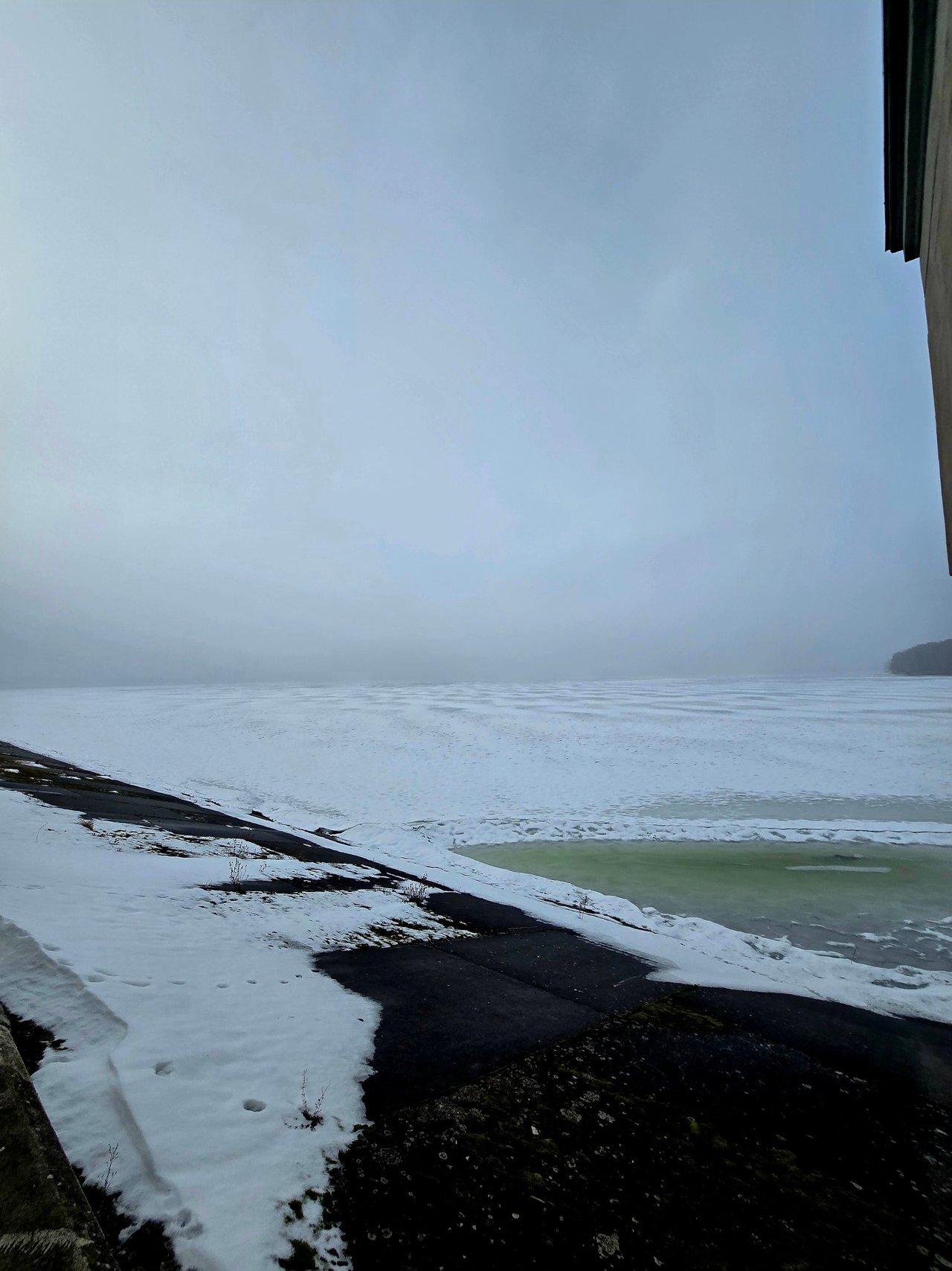 Po około 7,5 km walki z lodem w lesie w końcu dobiegam do zapory w Goczałkowicach. Zostaje jakieś 1,5 km do końca zapory i mogę zawracać. Ogromną ulgą był brak lodu — asfalt po lesie okazał się przyjemną odmianą od leśnej „jazdy figurowej na lodzie”. Jedyny minus to wiatr, który na otwartej przestrzeni potrafił mocno wychłodzić i skutecznie przypominał, że to nadal środek zimy.