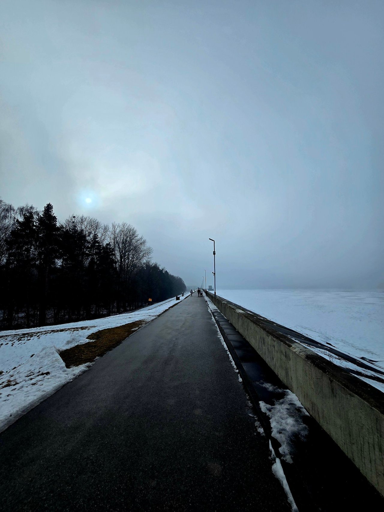 Sunday long run in full winter mode. Silence, grey tones, and a few very long straights stretching through the forest and along the water. Perfect scenery for an easy base run.