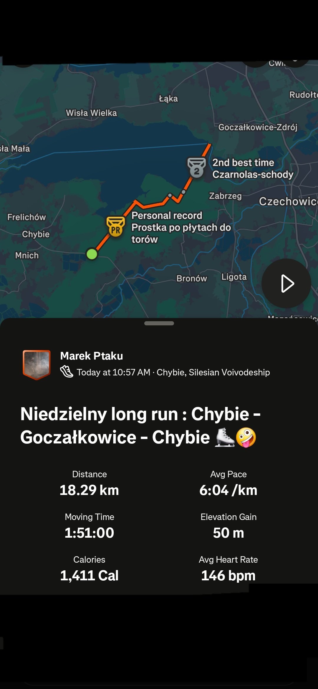 Został powrót tą samą trasą. Ta sama walka z lodem, to samo skupienie na każdym kroku, do tego narastające zmęczenie i niekończące się, długie proste, które testują głowę bardziej niż nogi. Tempo dalej równe, bez szarpania — baza miała pozostać bazą. Finalnie 18,29 km, średnie tempo 6:04/km, średnie tętno 146 bpm. Ciężko, zimowo, ale uczciwie zrobiona robota.
