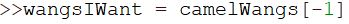 The middle two wangs wouldbe like [1:2]. So on and so forth. Lets the camel wang vendor has dozens of wangs to sell you and you just want the last one on that list. You don’t want to count how many wangs and specify the last one… good thing you can specify the last element like this: